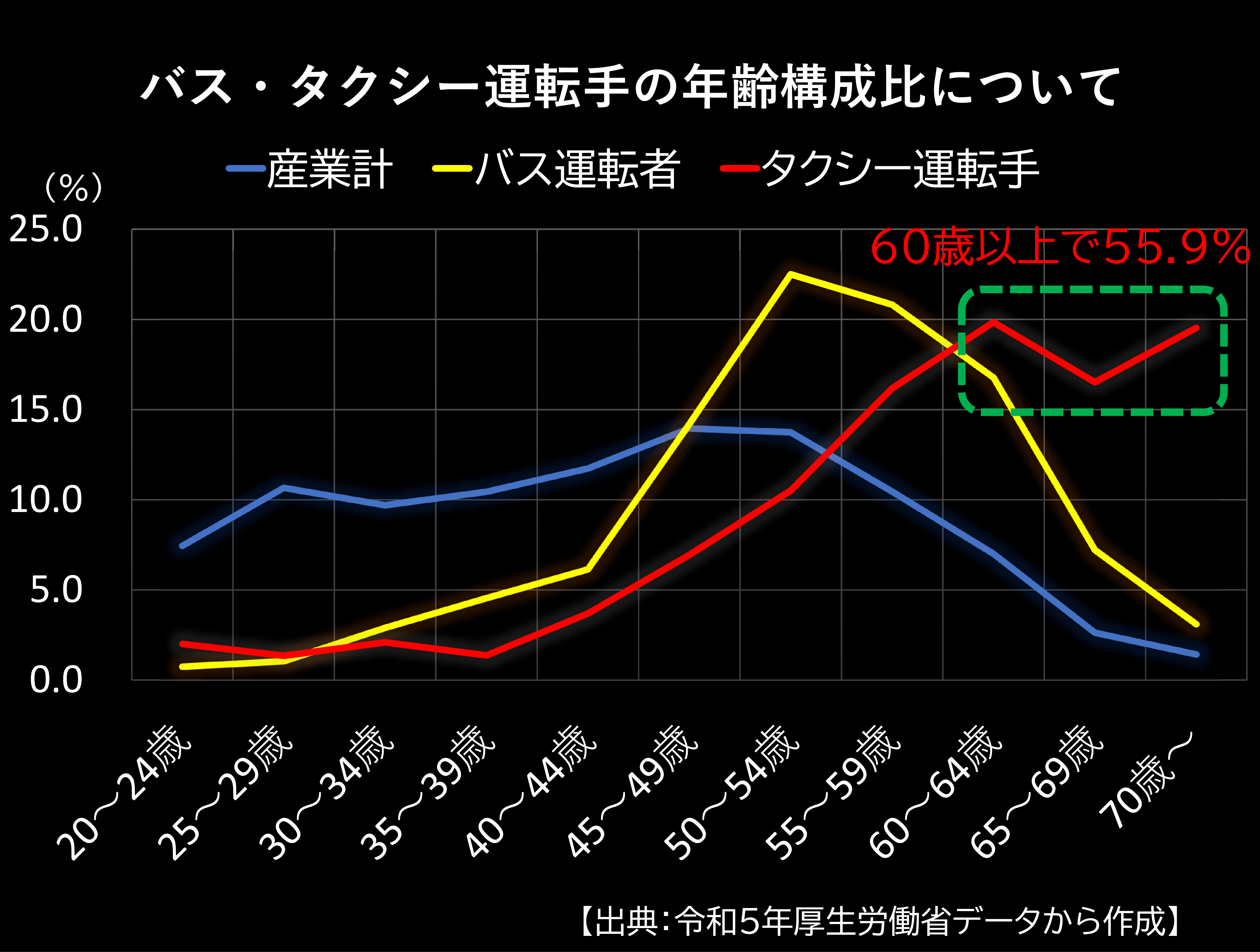上の図は、バス・タクシー運転手の年齢構成比についてですが、特にタクシー運転手は高齢化していて、60歳以上で55.9%、このうち70歳以上が20%近くを占めています。