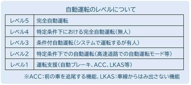自動運転技術は、下図のように、5つのレベルに分類されています。